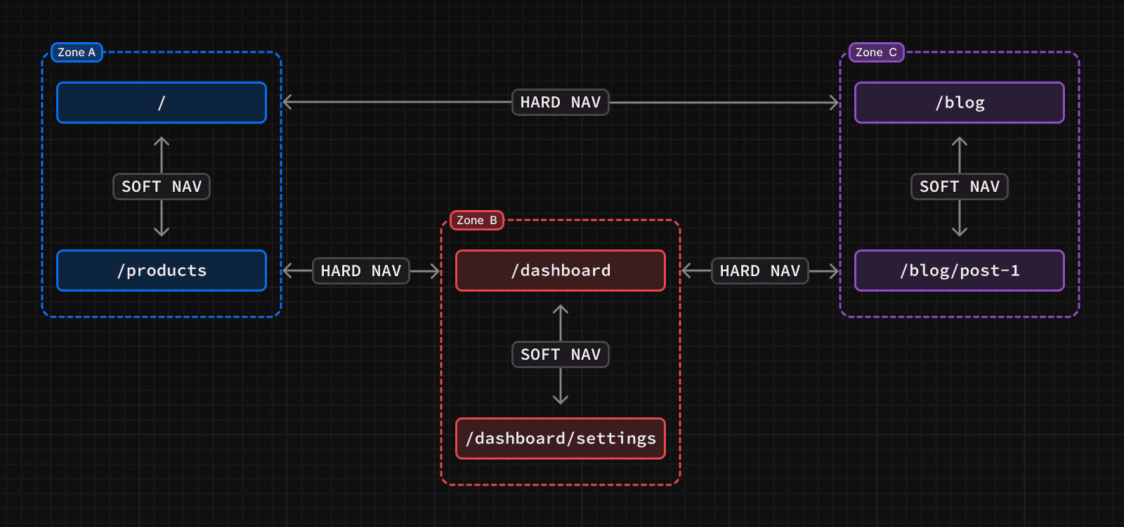 Vertical microfrontends are an architecture where multiple applications are served on one production domain, split into "zones". Each path for the domain is handled by one of the applications.